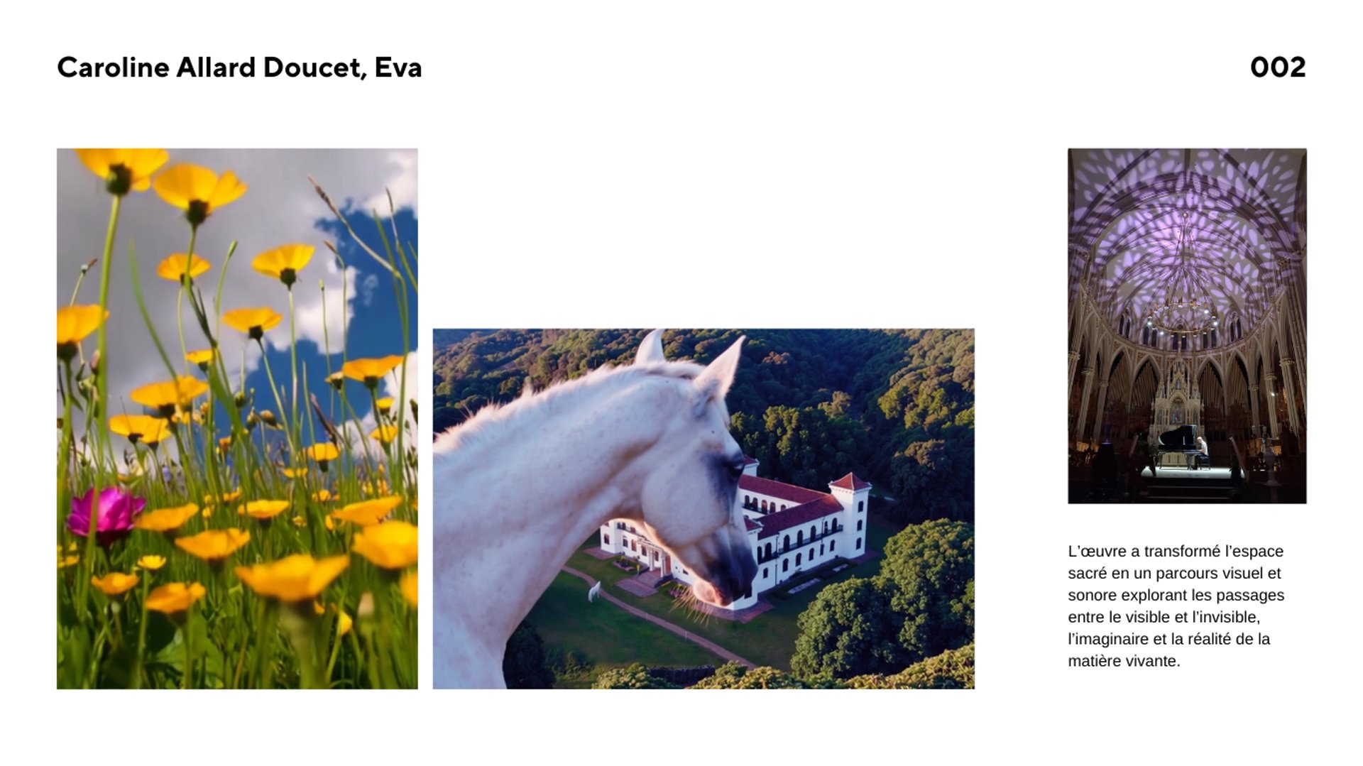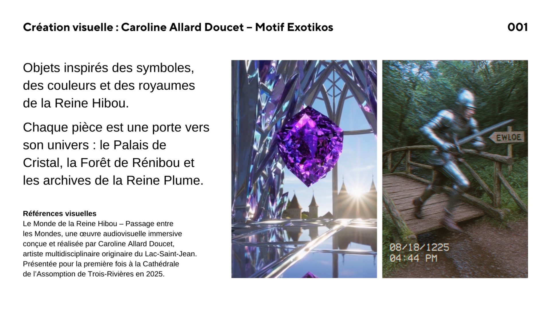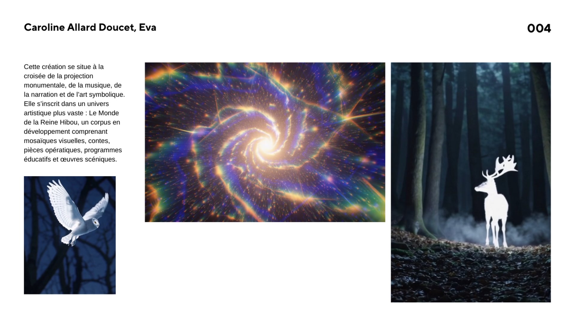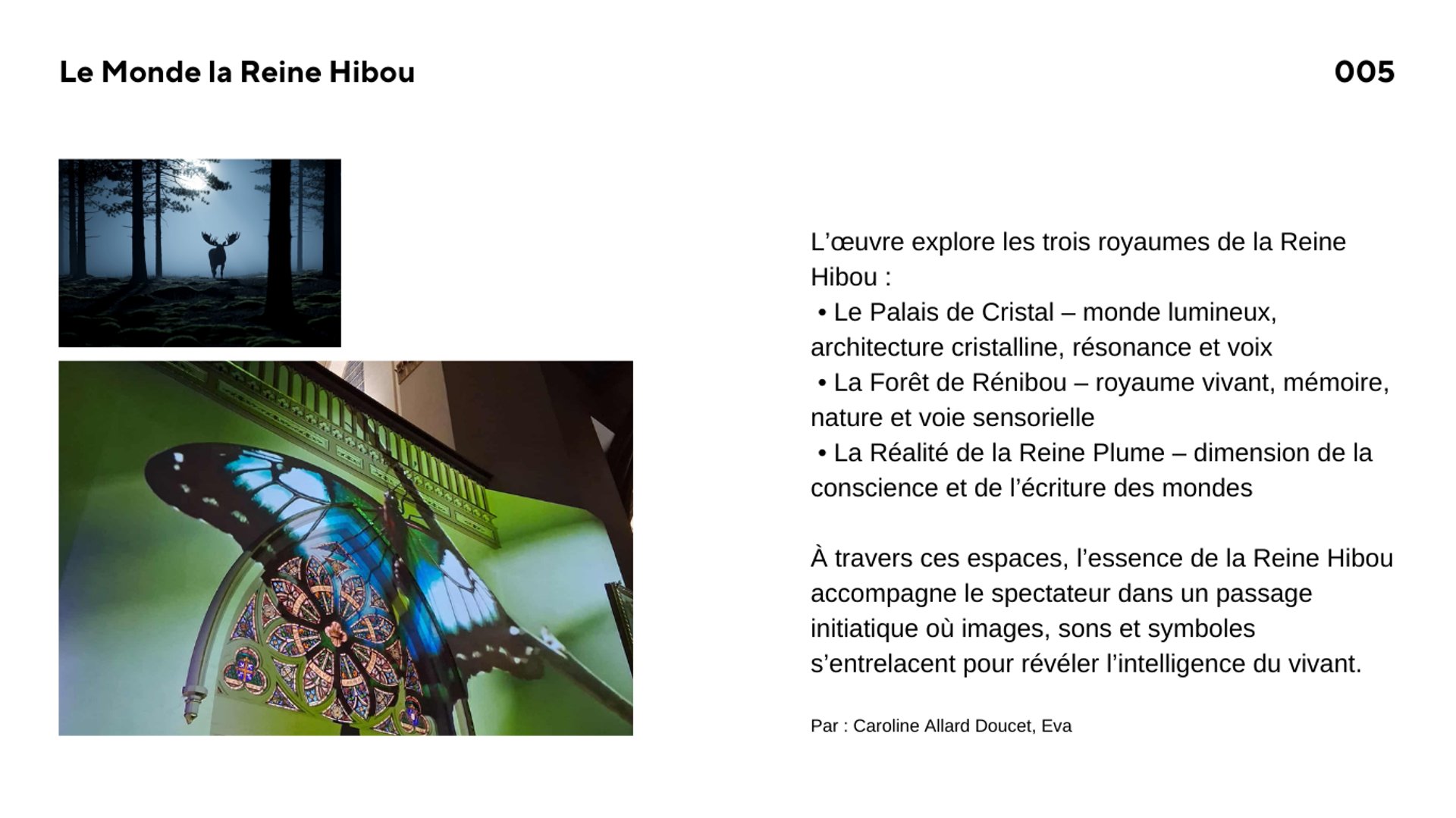 Une œuvre audiovisuelle immersive présentée en projection grand format. La création combine images générées par processus numérique issues du Monde de la Reine Hibou, conception artistique originale et composition sonore pour offrir un récit symbolique vivant.