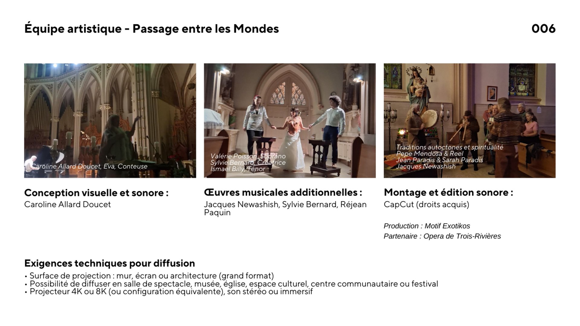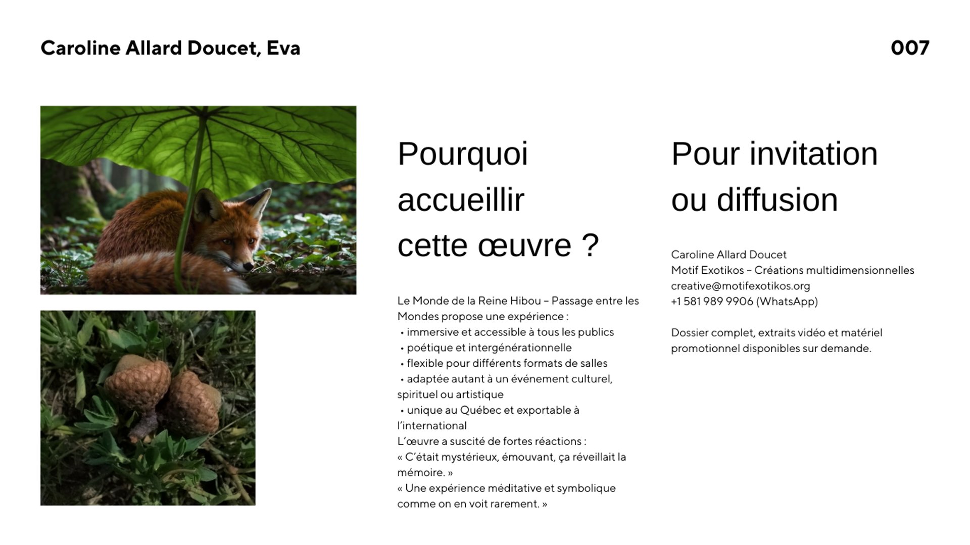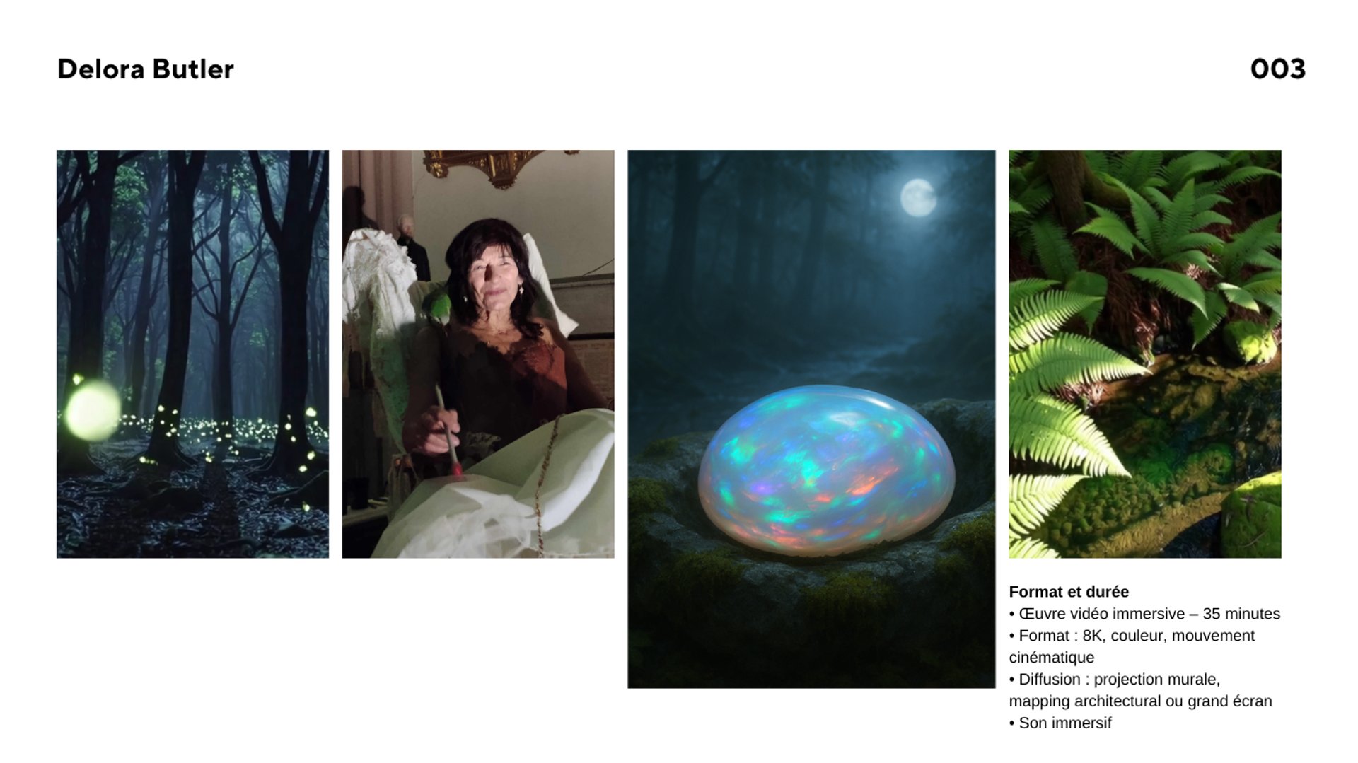 L'œuvre entraîne le public dans un univers où narration poétique, ambiance contemplative et exploration intérieure se rencontrent. L'expérience se vit dans un dispositif de projection qui favorise l'écoute, l'immersion et la sensibilité des sens.