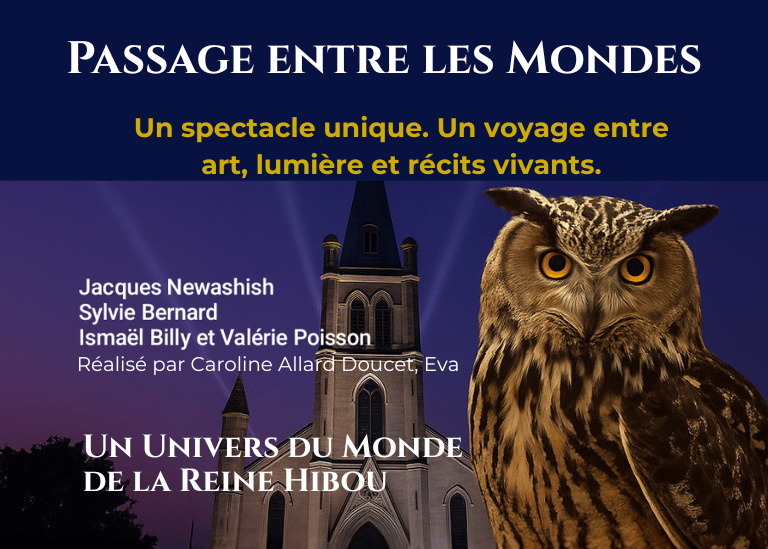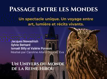 Une œuvre audiovisuelle immersive présentée en projection grand format. La création combine images générées par processus numérique issues du Monde de la Reine Hibou, conception artistique originale et composition sonore pour offrir un récit symbolique vivant.